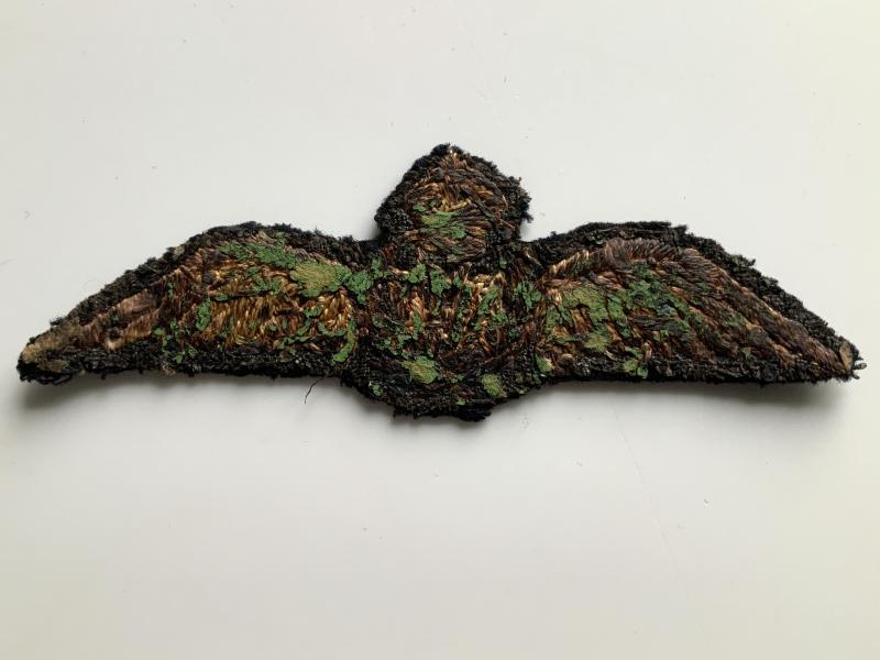 Here we have another original variation of the RAF Pilots Wings Wing. Flat ten feathers pattern issued Circa 1939-45. Removed from uniform with age and service wear. Note the A in the RAF scarce example.