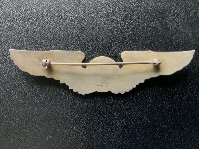 This is a scarce WWII USAAF Combat Observer Wing. Pin back with safety clasp in sterling silver marked marked, made by LGB. This is quality manufacturer with detailed feathering, solid one piece strike.