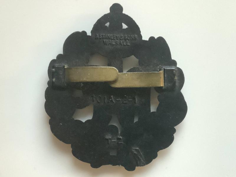 An RAF in near mint condition, Bakelite, or plastic economy cap badge for wartime use by the RAF. approx 1.75" by 1.5" with brass prong fittings. maker marked on reverse Stanley and sons Walsal.