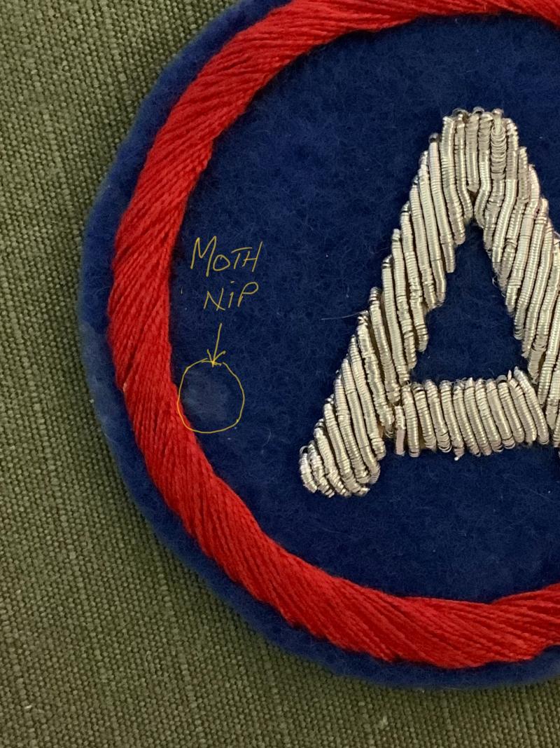 A 3rd Army Officer’s hand embroidered sleeve patch in bullion thread on wool. Retains some of the paper backing. Slight moth as indicated on image 3.