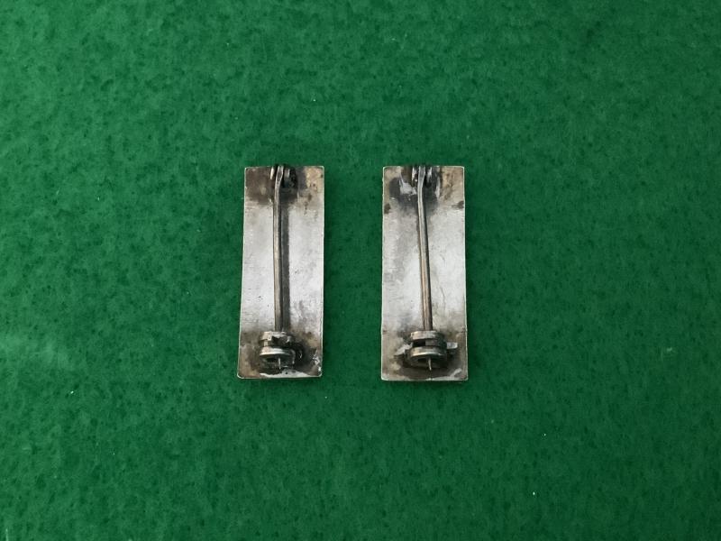 A pair of US Army 1st Lieutenant rank bars. Pin back with safety catches. Age and service wear.