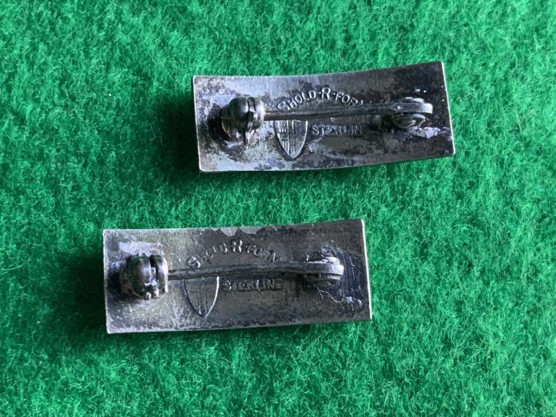 A matching pair of 1st Lieutenant rank bars, pin back wire safety catches, maker marked by Meyer New York.