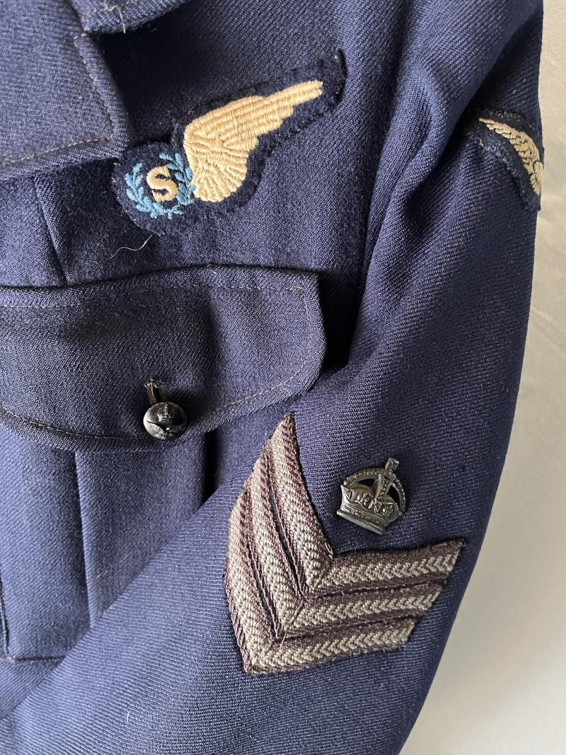 RAAF Flight Sergeant Signaller tunic in the dark blue with belt. Named and dated 1942, rank stripes with metal crown, with belt. In good condition.