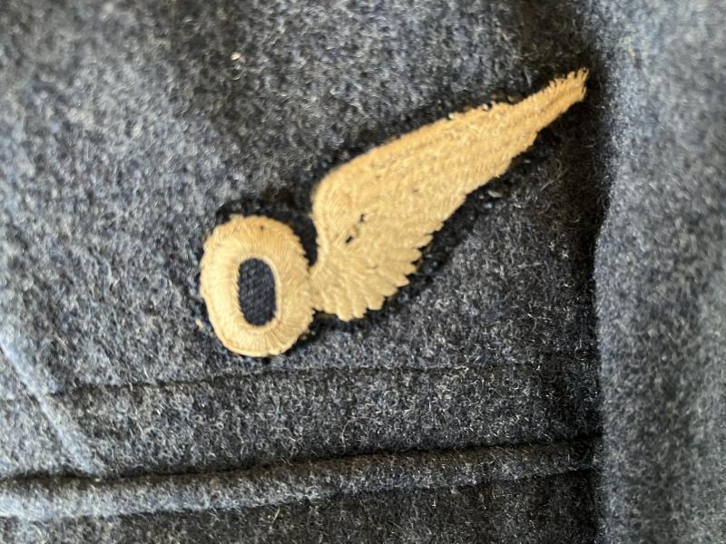 WWII Flight Sargeant Aircrew battle dress blouse tunic. Name tag on pocket to a Pomeroy (maybe a New Zealander) Size 2 by Leaning & C0. Dated November 1942. Sewn under the collar is Gold Fish Club patch. Comes with an Air Ministry whistle, A padded Observer wing.. Good condition no moth.