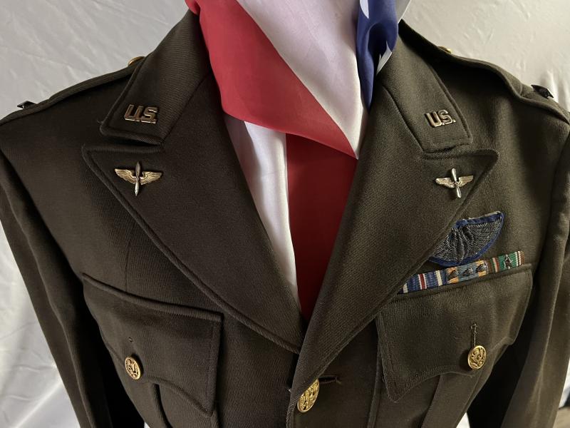 The tunic is fully badged featuring a rare bullion combat Bombardier wing below is a three piece medal bar with ribbons for the Distinguished Flying Cross, Air Medal with clusters and the ETO with campaign star.