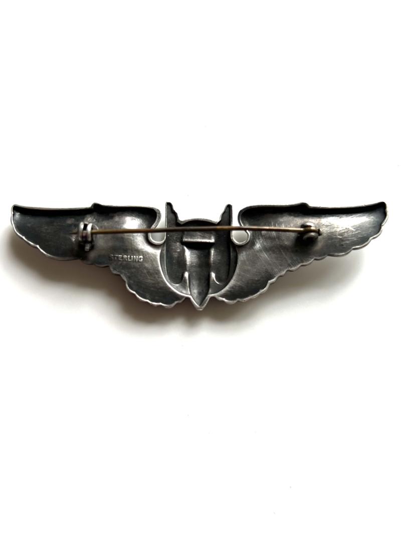 A WWII USAAF Air Gunner Wing. Pin back with safety clasp, in sterling silver. One piece construction bulletin on target. Full size at 3’