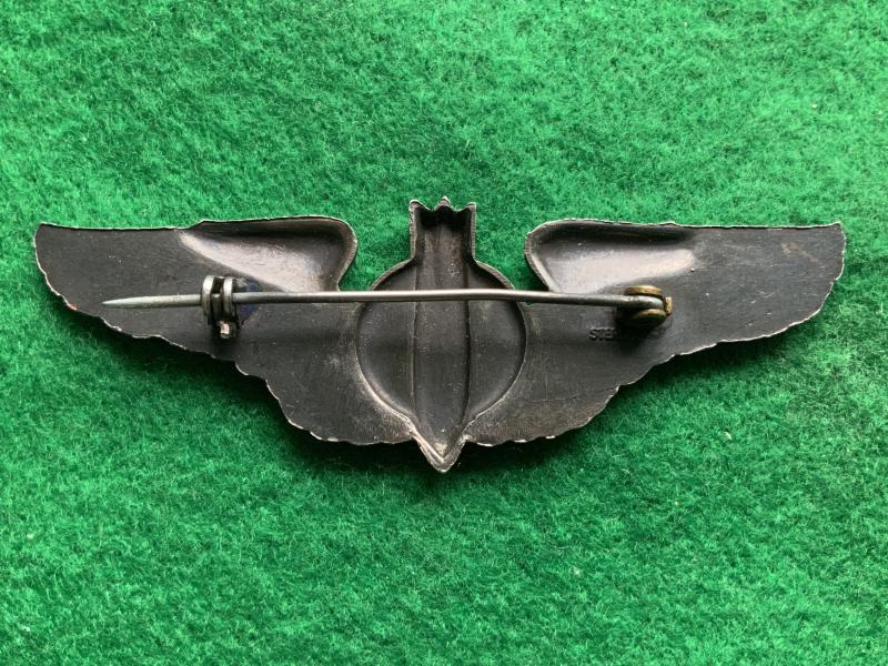 An early USAAF Bombardier wing, Bomb on target w pin back example complete with safety catch and in sterling silver. An excellent one piece heavy strike example. Note Pin may have been replaced.