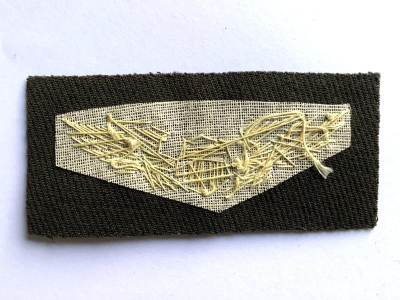 Here is a scarce USAAF Pilot wing in bullion thread on a brown barathea cloth. Un-issued mint condition, heavy thread and a quality work. Measures 3 3/4” x 1 3/4”