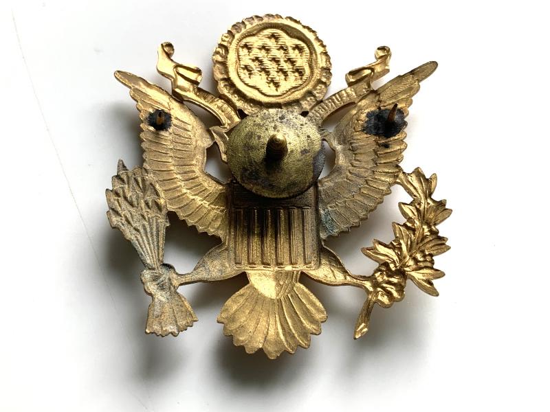 WWII US Army/Air Force officers service cap badge. Solid and and detailed strike wioth age and service wear, not maker marked, with a screw back fitting. Measures 2 1/8” x 2 3/8” tall