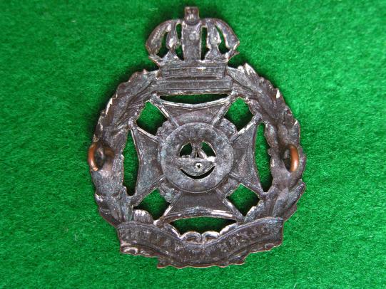 A blackened Royal Rifles of Canada cap badge with two lugs. Measures 2 1/8" x 1 3/4"