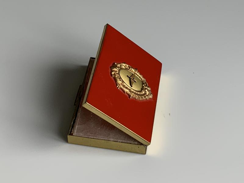 Here is a ladies power compac in very good condition red lid with the Air Corps insignia to front. Lock clip to the front with a mirror to the inside of the lid and the powder pad and powder in the base.