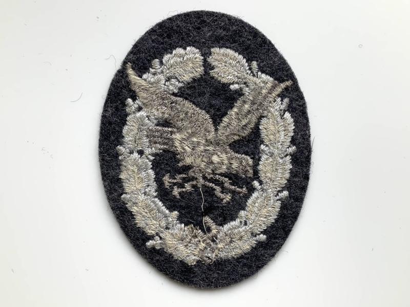 A Luftwaffe Radio Operators Cloth Badge, embroidered in silver grey thread on blue wool backing. The badge depicts a flying eagle clutching lightning bolts, In good condition one very small hole as indicated on image 3.