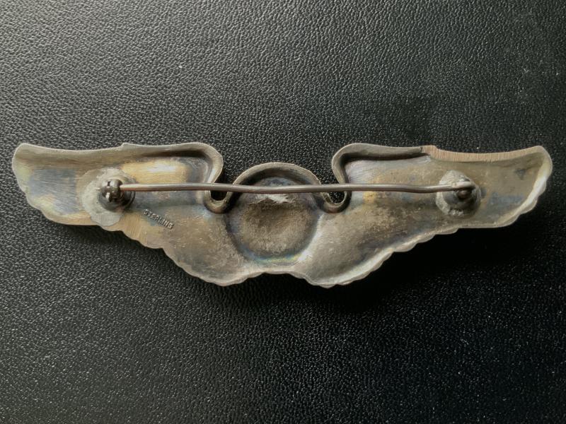 Here we have a USAAF Aircrew Member. Pin back example in Sterling Silver. One piece construction which is one of the best Aircrew wing I have seen. With service wear and patina.