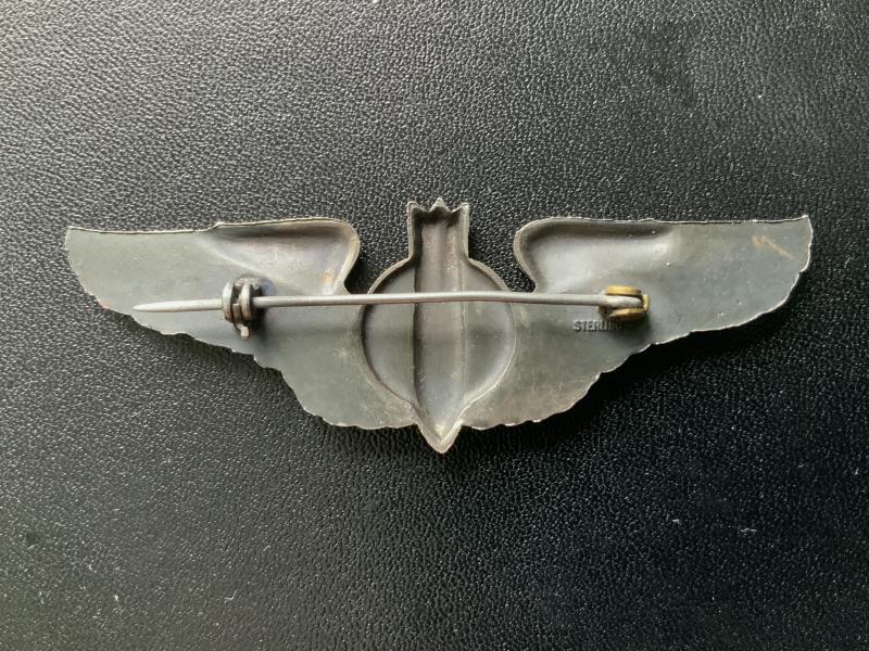 Here is a WWII period USAAF Bombardier Wing. Pin back example in sterling silver, one piece construction with age and service wear. Full size at 3”