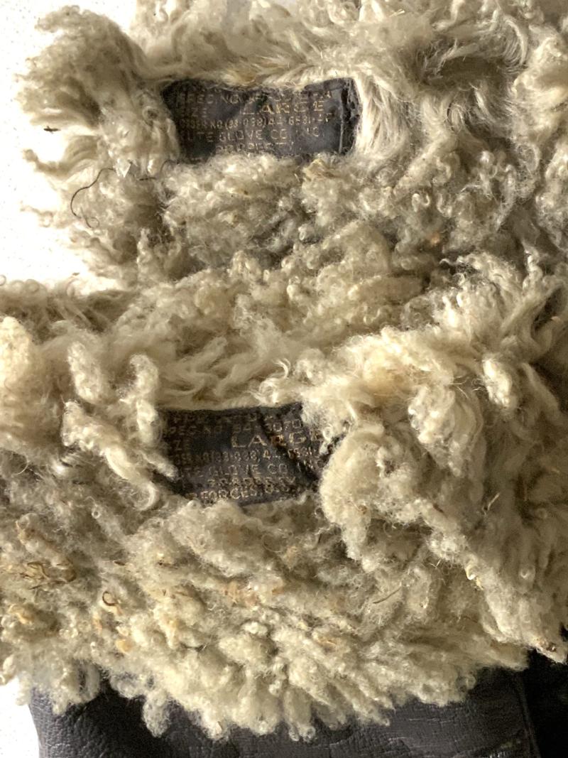 Pair of Type A-9A Gauntlet, Flying, Winter. Maker is Elite Gloves in leather with mouton fir.In good condition with age and service wear. In a large size, official label is in the left hand clove.