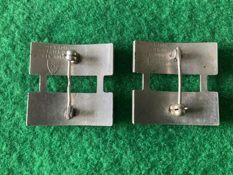 A matching pair of US Army Captain rank insignia. Pin back and maker marked Shoulder Form NS Meyer New York.