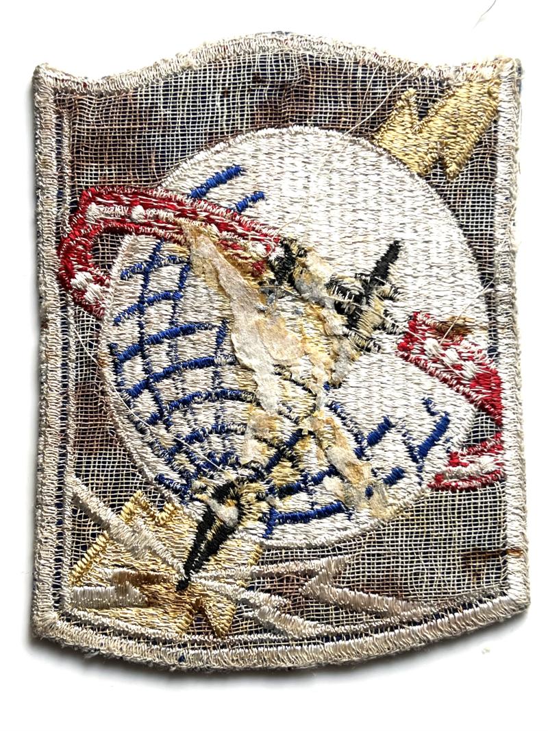A USAAC Jacket patch. The dots and dashes on the red band is Morse code for AACS. The patch was worn from WWII into the 1950’s.. Thsi is a wwii example which has been removed from a collectors album and has residue on the back.