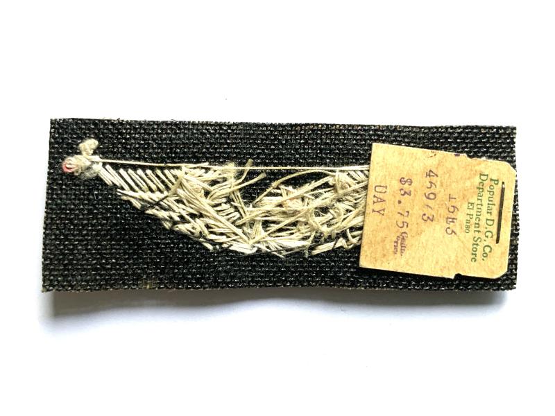 Here we have a scarce USAAF tan summer issue WWII Combat Observer Wing in bullion thread. Unissued and in mint condition, still has a sales tag pinned to the back. Some age but no wear.