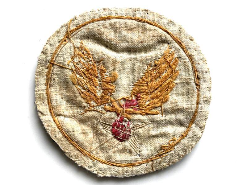 This is an English made WWII USAAF Officers Air Corps sleeve patch in bullion. Good period piece with a chain stitch border on blue velvet with a cotton cloth back. Patina with age and service wear. A very good period example.